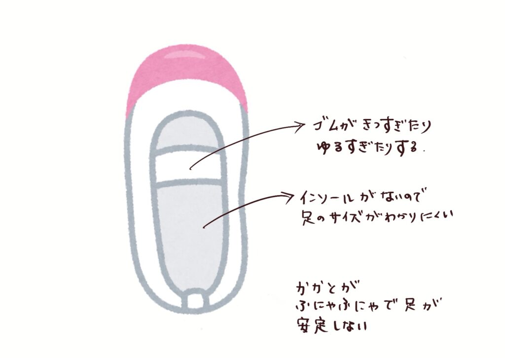 足がゴムで固定されないと、上履きが脱げやすくなります。転びやすくなって危険ですし、きついと足の成長の妨げになりますね。